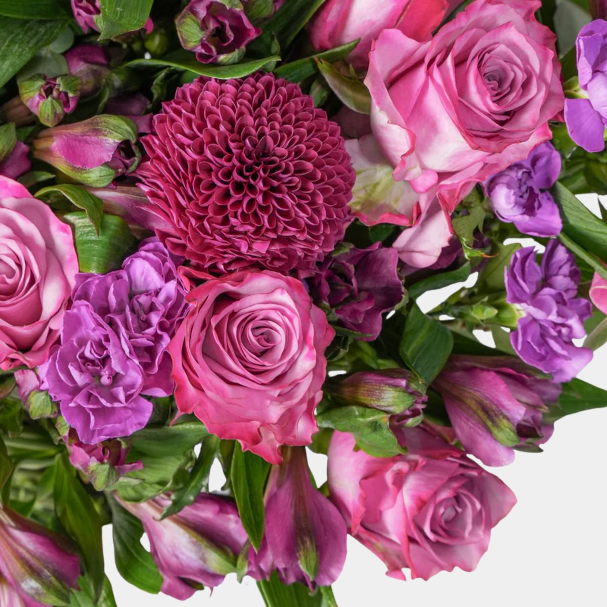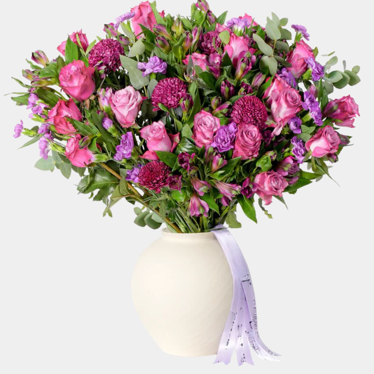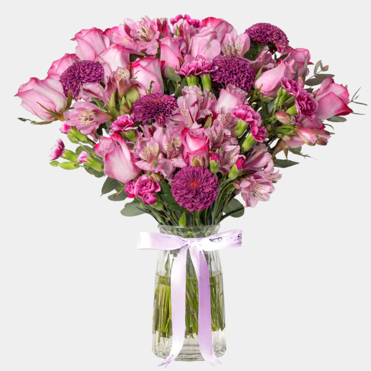 تُقدّم مزهرية فلورا أميثيست باقة زهور راقية تُجسّد عمق وجمال اللون الأرجواني في عالم البستنة. يجمع هذا التنسيق المُختار بعناية أربعة أنواع من الزهور الفاخرة، تم اختيار كل منها لخصائصها المُميزة وكثافة ألوانها. تتوسط الباقة ورود أرجوانية داكنة، تُضفي لمسة فخمة بفضل بتلاتها المخملية وأناقتها الكلاسيكية. وتُكمّل هذه الورود زهور القرنفل الأرجوانية النابضة بالحياة، المعروفة بطول عمرها وتماسكها في التنسيقات. كما تُثري زهور ألستروميريا الأرجوانية الرقيقة التنسيق، مُضيفةً إليه عمقًا في الملمس وحركة انسيابية. أما زهور الأقحوان الأرجوانية الجريئة، فتُشكّل نقاط جذب بصرية، مُضفيةً تباينًا ثلاثي الأبعاد من خلال شكلها الكروي المُميز. يُنتج هذا المزيج المُتوازن بعناية عرضًا بصريًا آسرًا ينتقل بسلاسة من درجات الألوان العميقة والزاهية إلى لمسات أرجوانية أكثر إشراقًا. يُظهر التنسيق تناغمًا لونيًا بارعًا مع الحفاظ على جاذبية بصرية من خلال تنوّع أشكال وأحجام الزهور. تُعدّ مزهرية فلورا أميثيست خيارًا مثاليًا لمن يبحث عن قطعة مميزة تُعبّر عن الرقي والذوق الرفيع، فهي تُضفي لمسة جمالية آسرة على أي مساحة داخلية بفضل تصميمها الجذاب والمتناغم. مثالية للمناسبات الخاصة، أو في بيئات العمل، أو كهدية مميزة لأصحاب الذوق الرفيع.