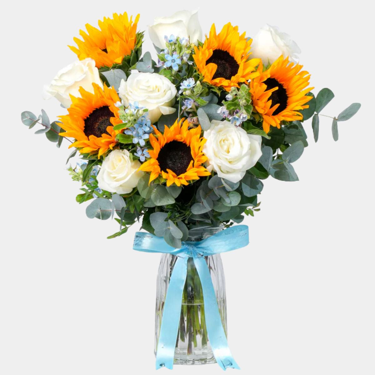 تجسد مزهرية "أشعة الشمس الأنيقة" الزجاجية جوهر يوم صيفي مثالي بمزيجها المختار بعناية من أجود أنواع الورود البيضاء، وعباد الشمس المبهج، ونبات الأوكسيبتالوم الأزرق الرقيق. تم اختيار كل غصن يدويًا وتنسيقه بعناية ليُحاكي صفاء ودفء السماء الصافية، مما يخلق لوحة فنية تُضفي إشراقة بصرية وبهجة على أي مكان. يُحقق هذا التنسيق توازنًا مثاليًا بين الرقي والبساطة. تُضفي الورود البيضاء الناصعة أناقة خالدة وتُشكل خلفية محايدة، بينما تُضفي عباد الشمس دفئًا طبيعيًا وتفاؤلًا. يُضيف نبات الأوكسيبتالوم الأزرق الرقيق عمقًا ولمسة عصرية رقيقة، مما يمنع التنسيق من أن يبدو تقليديًا للغاية. تُعد هذه المزهرية مثالية للاحتفال بالمناسبات الهامة، أو التعبير عن الامتنان، أو ببساطة لإضفاء البهجة على يوم شخص ما، فهي تُناسب تمامًا كقطعة مركزية في غرف المعيشة، أو المكاتب، أو كهدية تذكارية. يضمن حجمها الكبير وتنوع ملمسها الحفاظ على تأثيرها البصري من زوايا متعددة. يتم تنسيق كل باقة بخبرة في مزهرية زجاجية فاخرة تُكمل جمال الزهور مع الحفاظ على جمالها الطبيعي كنقطة محورية. مثالية لأولئك الذين يقدرون فن تنسيق الزهور الراقي ويبحثون عن هدية تجمع بين الدفء والرقي.
