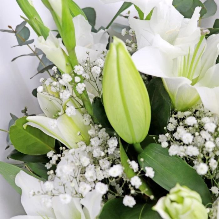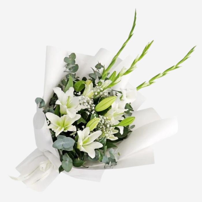 Bursting with beauty, our Love And Comfort sheaf bouquet can convey your support and heartfelt sympathy when no words can. It's designed with elegant Oriental lilies, slender gladioli, sweet camellias and delicate baby's breath, as well as perfectly placed accents of native gum foliage.