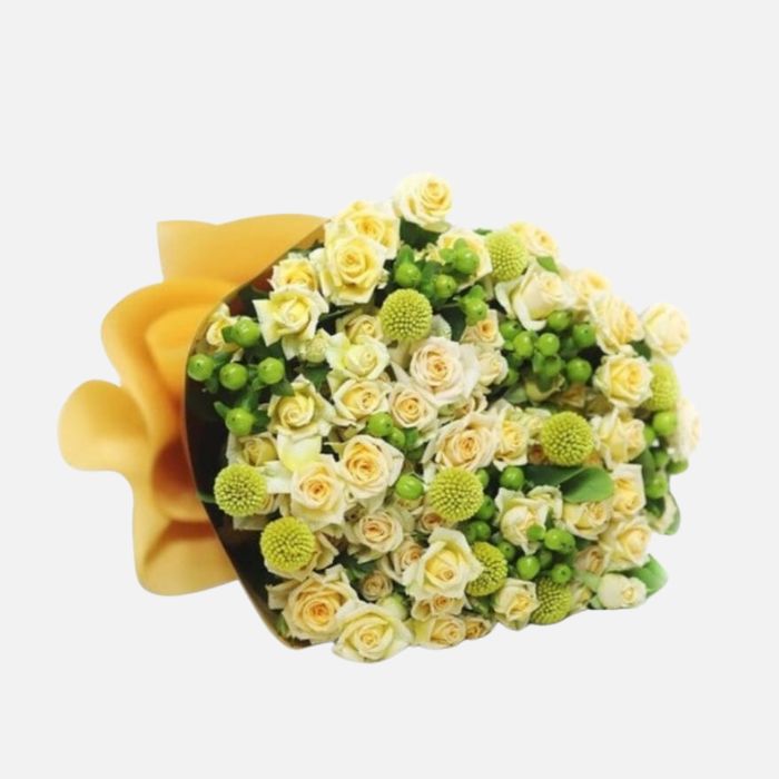 A hand bouquet of 10 white baby roses with green hypericum.