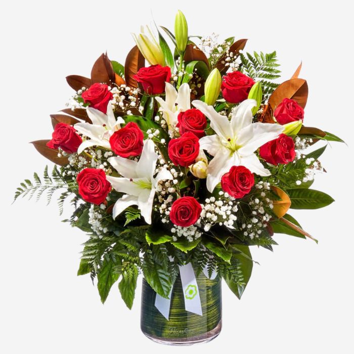 Send pure love with our premium flower vase filled with one dozen long stem red roses, perfumed white oriental lilies and a selection of seasonal foliages. This elegant, leaf-lined glass vase arrangement also features accents of babies breath for a soft, classical look. Simply beautiful! Our red rose and lily flower vase smells divine and is guaranteed to make someone feel very special.